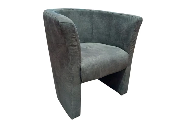 Malé zaoblené kreslo je očalúnené tmavo šedou látkou v optike brúsenej kože. Ľahko ho umiestnite aj do menšieho priestoru.