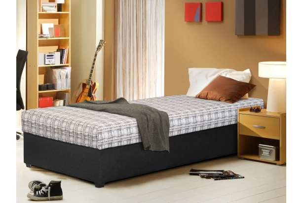 Kompletná jednolôžková posteľ (váľanda) so zabudovaným roštom, polyuretanovým matracom a praktickým úložným priestorom v dolnej časti. Potiahnutá kombináciou šedej látky a károvaného vzoru.