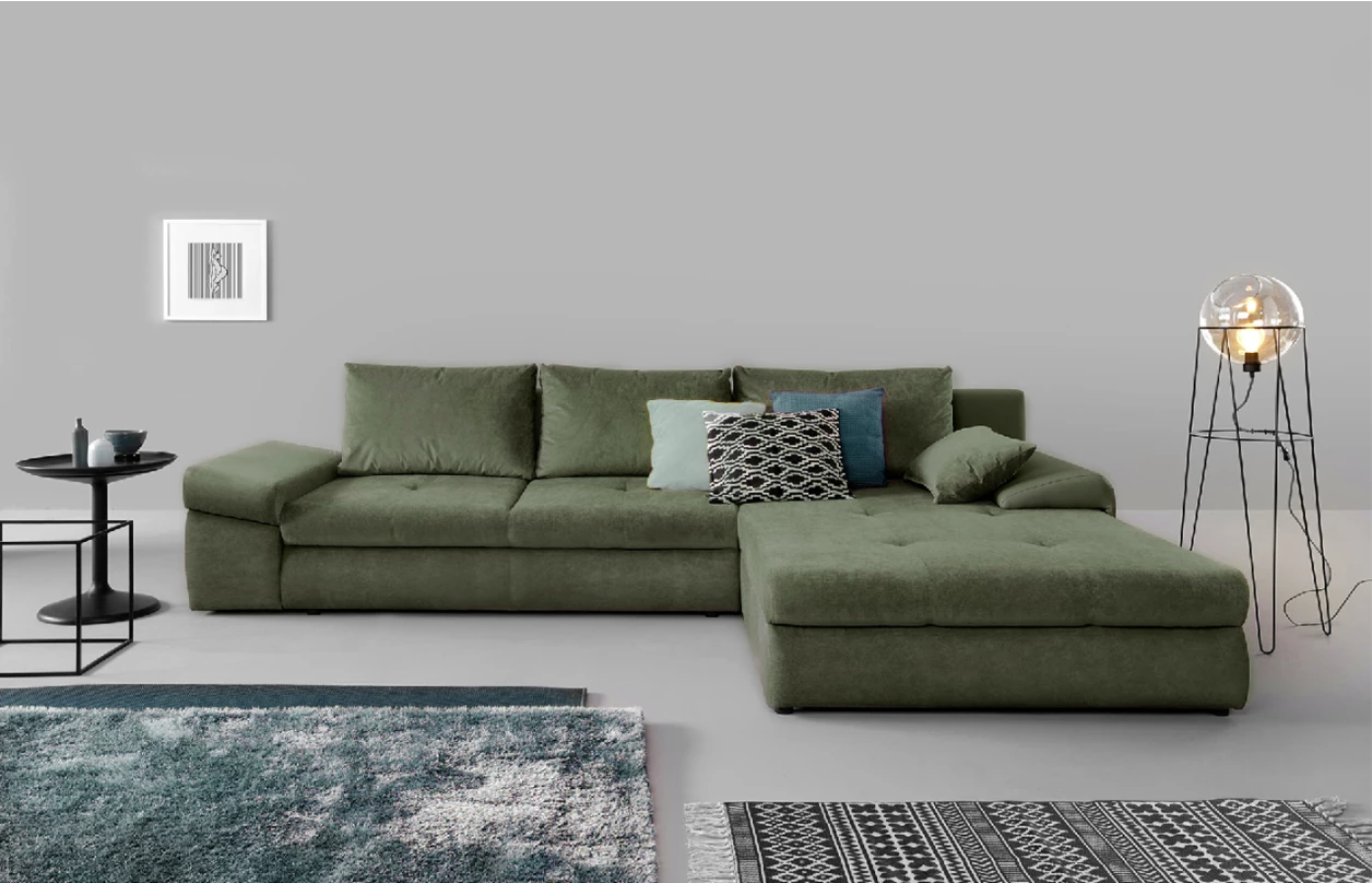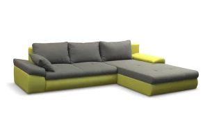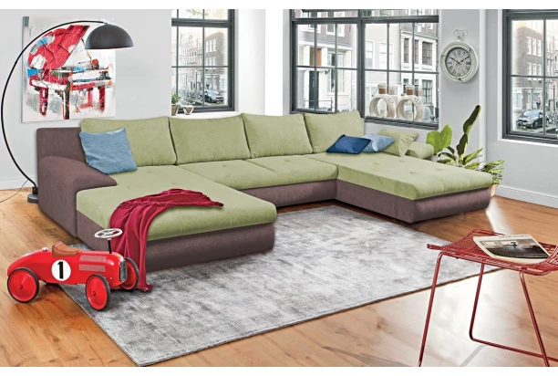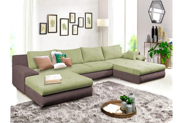 Extra priestranná sedacia súprava v tvare U podľa aktuálnych trendov. Oceníte nielen priestrannosť a pohodlie širokých otomanov pri domácej relaxácii, ale aj funkciu rozkladu a úložný priestor. Očalúnená kombináciou mäkkučkých látok v odtieni zelená a tmavo hnedá.