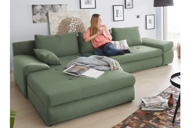 Komfortná rohová sedacia súprava v zaoblených tvaroch pre každý moderný interiér. Očalúnená odolnou látkou vo farbe rákosovo zelená. U sedačky oceníte nielen jej pohodlie, úložný priestor a funkciu rozkladu, ale aj možnosť univerzálneho zostavenia ako pravý alebo ľavý roh. Otoman sedačky tak môže byť umiestnený na pravú alebo ľavú stranu – ľahko podľa vašej potreby.