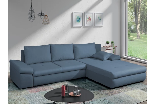 Komfortná rohová sedacia súprava v zaoblených tvaroch pre každý moderný interiér. Očalúnená odolnou látkou vo farbe denimovo modrá. U sedačky oceníte nielen jej pohodlie, úložný priestor a funkciu rozkladu, ale aj možnosť univerzálneho zostavenia ako pravý alebo ľavý roh. Otoman sedačky tak môže byť umiestnený na pravú alebo ľavú stranu – ľahko podľa vašej potreby.