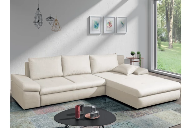Komfortná rohová sedacia súprava v zaoblených tvaroch pre každý moderný interiér. Očalúnená odolnou látkou vo farbe krémová. U sedačky oceníte nielen jej pohodlie, úložný priestor a funkciu rozkladu, ale aj možnosť univerzálneho zostavenia ako pravý alebo ľavý roh. Otoman sedačky tak môže byť umiestnený na pravú alebo ľavú stranu – ľahko podľa vašej potreby.