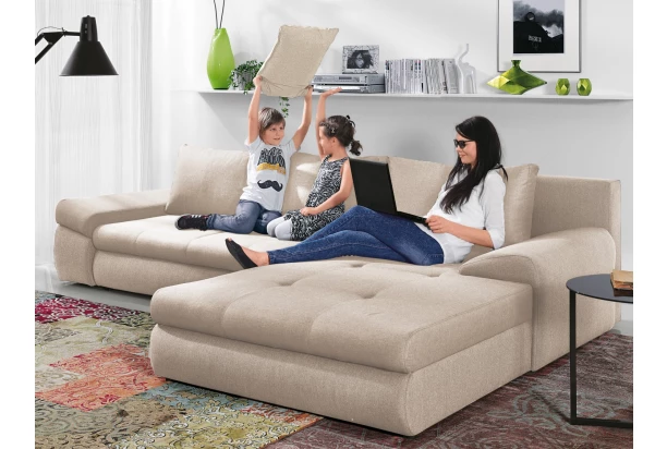 Komfortná rohová sedacia súprava v zaoblených tvaroch pre každý moderný interiér. Očalúnená odolnou látkou vo farbe béžová. U sedačky oceníte nielen jej pohodlie, úložný priestor a funkciu rozkladu, ale aj možnosť univerzálneho zostavenia ako pravý alebo ľavý roh. Otoman sedačky tak môže byť umiestnený na pravú alebo ľavú stranu – podľa vašej potreby.