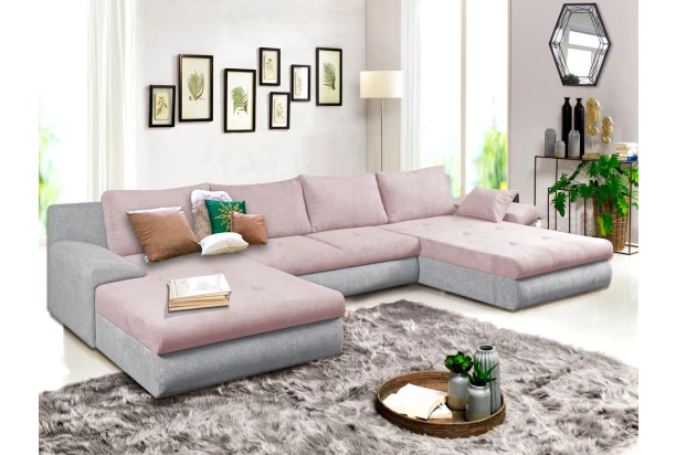 Extra priestranná sedacia súprava v tvare U podľa aktuálnych trendov. Oceníte nielen priestrannosť a pohodlie širokých otomanov pri domácej relaxácii, ale aj funkciu rozkladu a úložný priestor. Očalúnená kombináciou mäkkučkých látok v odtieni ružová a svetlo šedá..