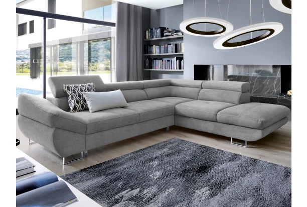Rohová sedacia súprava Fabio s otomanom umiestneným na pravej strane je ideálnym spojením moderného dizajnu a pohodlného štýlu sedenia. Očalúnená príjemne mäkkou látkou vo svetle šedom odtieni. Vrátane polohovania opierok, úložného priestoru aj rozkladacej funkcie.