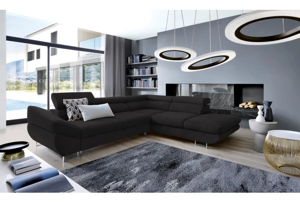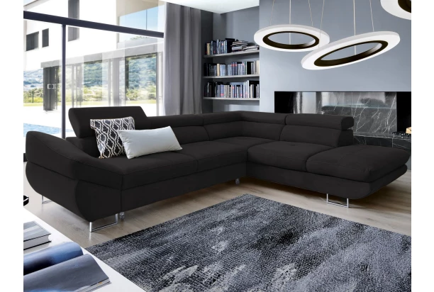 Rohová sedacia súprava Fabio s otomanom umiestneným na pravej strane je ideálnym spojením moderného dizajnu a pohodlného štýlu sedenia. Očalúnená príjemne mäkkou látkou vo farbe čierna. Vrátane polohovania opierok, úložného priestoru aj rozkladacej funkcie.