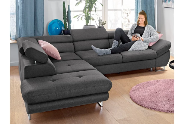 Rohová sedacia súprava Fabio s otomanom umiestneným na ľavej strane je ideálnym spojením moderného dizajnu a pohodlného štýlu sedenia. Očalúnená príjemne mäkkou látkou v stredne šedom odtieni. Vrátane polohovania opierok, úložného priestoru aj rozkladacej funkcie.