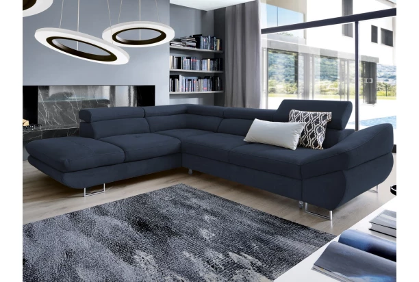 Rohová sedacia súprava Fabio s otomanom umiestneným na ľavej strane je ideálnym spojením moderného dizajnu a pohodlného štýlu sedenia. Očalúnená príjemne mäkkou látkou vo farbe tmavo modrá. Vrátane polohovania opierok, úložného priestoru aj rozkladacej funkcie.