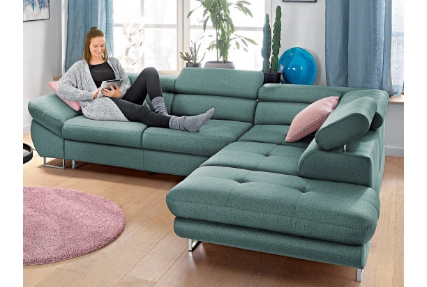 Rohová sedacia súprava Fabio s otomanom umiestneným na pravej strane je ideálnym spojením moderného dizajnu a pohodlného štýlu sedenia. Očalúnená príjemne mäkkou látkou v odtieni modro-zelená aqua. Vrátane polohovania opierok, úložného priestoru aj rozkladacej funkcie.
