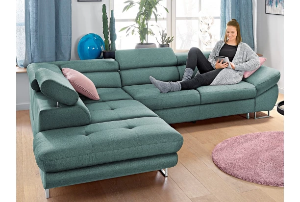 Rohová sedacia súprava Fabio s otomanom umiestneným na ľavej strane je ideálnym spojením moderného dizajnu a pohodlného štýlu sedenia. Očalúnená príjemne mäkkou látkou v odtieni modro-zelená aqua. Vrátane polohovania opierok, úložného priestoru aj rozkladacej funkcie.