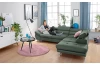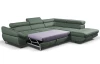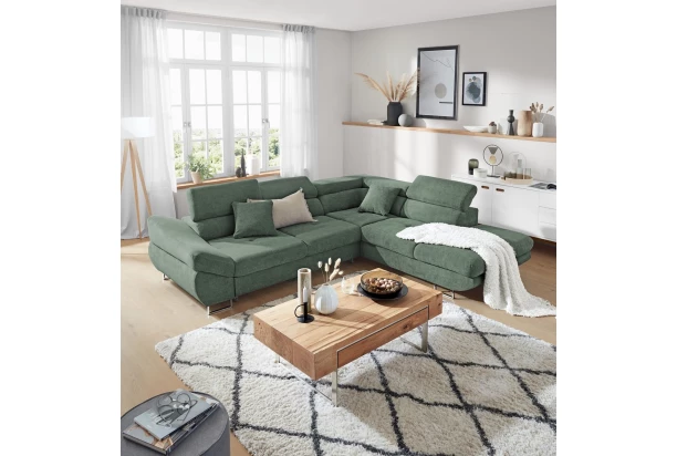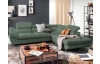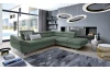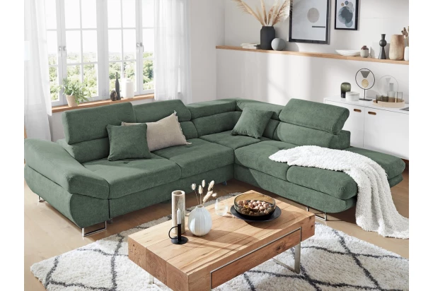 Rohová sedacia súprava Fabio s otomanom umiestneným na pravej strane je ideálnym spojením moderného dizajnu a pohodlného štýlu sedenia. Očalúnená príjemne mäkkou látkou v odtieni šedo-zelená. Vrátane polohovania opierok, úložného priestoru aj rozkladacej funkcie.