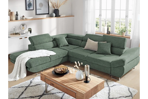 Rohová sedacia súprava Fabio s otomanom umiestneným na ľavej strane je ideálnym spojením moderného dizajnu a pohodlného štýlu sedenia. Očalúnená príjemne mäkkou látkou v odtieni šedo-zelená. Vrátane polohovania opierok, úložného priestoru aj rozkladacej funkcie.