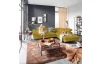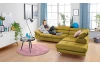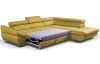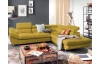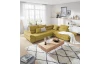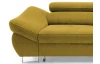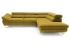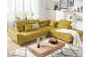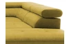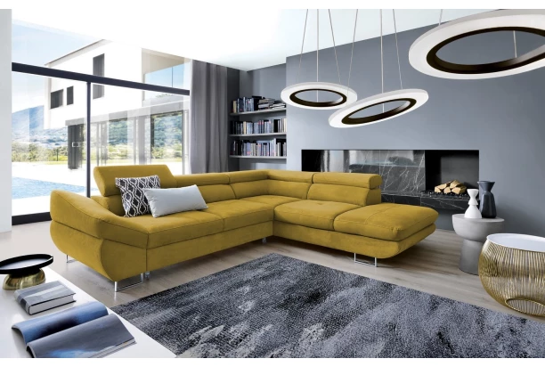 Rohová sedacia súprava Fabio s otomanom umiestneným na pravej strane je ideálnym spojením moderného dizajnu a pohodlného štýlu sedenia. Očalúnená príjemne mäkkou látkou vo farbe žltá kurkuma. Vrátane polohovania opierok, úložného priestoru aj rozkladacej funkcie.