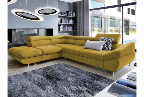 Rohová sedacia súprava Fabio s otomanom umiestneným na ľavej strane je ideálnym spojením moderného dizajnu a pohodlného štýlu sedenia. Očalúnená príjemne mäkkou látkou vo farbe žltá kurkuma. Vrátane polohovania opierok, úložného priestoru aj rozkladacej funkcie.
