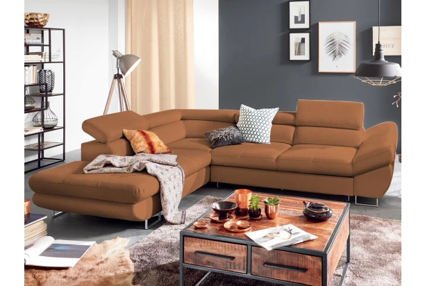 Rohová sedacia súprava Fabio s otomanom umiestneným na ľavej strane je ideálnym spojením moderného dizajnu a pohodlného štýlu sedenia. Očalúnená príjemne mäkkou látkou vo farbe hrdzavá. Vrátane polohovania opierok, úložného priestoru aj rozkladacej funkcie.