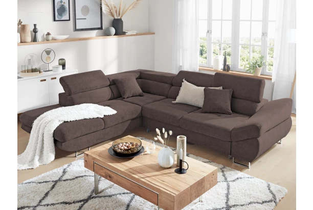 Rohová sedacia súprava Fabio s otomanom umiestneným na ľavej strane je ideálnym spojením moderného dizajnu a pohodlného štýlu sedenia. Očalúnená príjemne mäkkou látkou vo farbe hnedé espresso. Vrátane polohovania opierok, úložného priestoru aj rozkladacej funkcie.