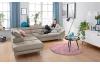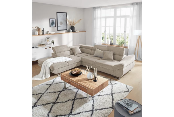 Rohová sedacia súprava Fabio s otomanom umiestneným na ľavej strane je ideálnym spojením moderného dizajnu a pohodlného štýlu sedenia. Očalúnená príjemne mäkkou látkou vo farbe béžová. Vrátane polohovania opierok, úložného priestoru aj rozkladacej funkcie.