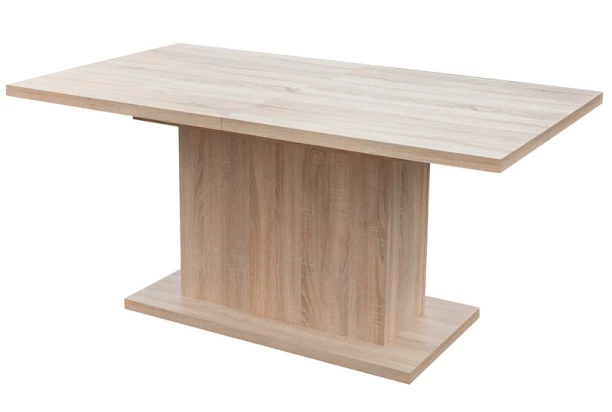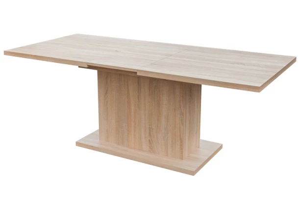 Obdĺžnikový jedálenský stôl v modernom štýle podľa aktuálnych trendov má stabilnú širokú nohu a rozkladaciu konštrukciu v kombinácii kovu a dekoru dub sonoma.