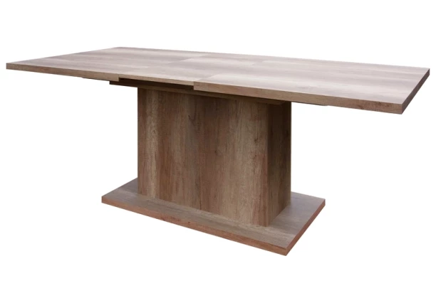 Obdĺžnikový jedálenský stôl v modernom štýle podľa aktuálnych trendov má stabilnú širokú nohu a rozkladaciu konštrukciu v kombinácii kovu a dekoru dub canyon.