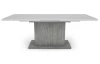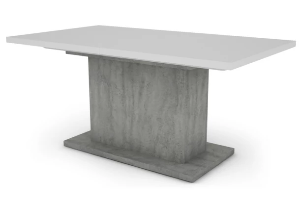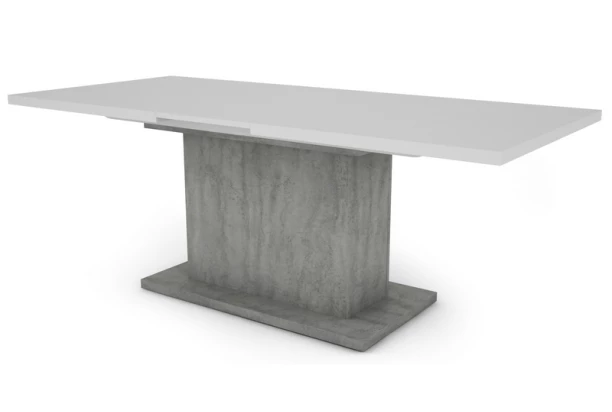 Obdĺžnikový jedálenský stôl v modernom štýle podľa aktuálnych trendov má stabilnú širokú nohu a rozkladaciu konštrukciu v kombinácii kovu, bielej farby a imitácie šedého betónu.