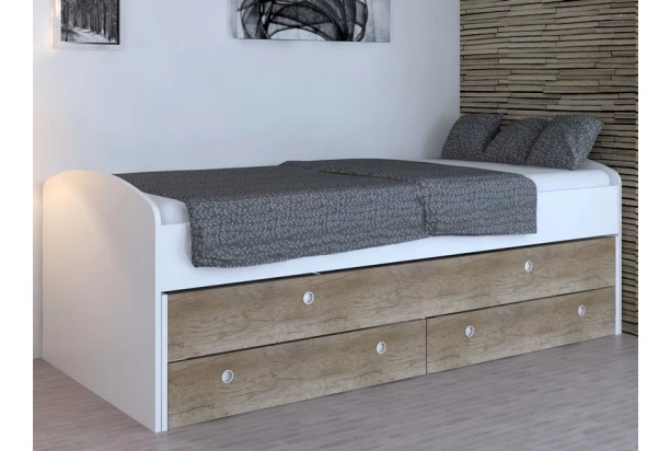 Posteľ obsahuje prídavné výsuvné lôžko a 2 úložné zásuvky, kam ľahko uschováte posteľnú bielizeň. Konštrukcia vyrobená v bielo-dubovej kombinácii.