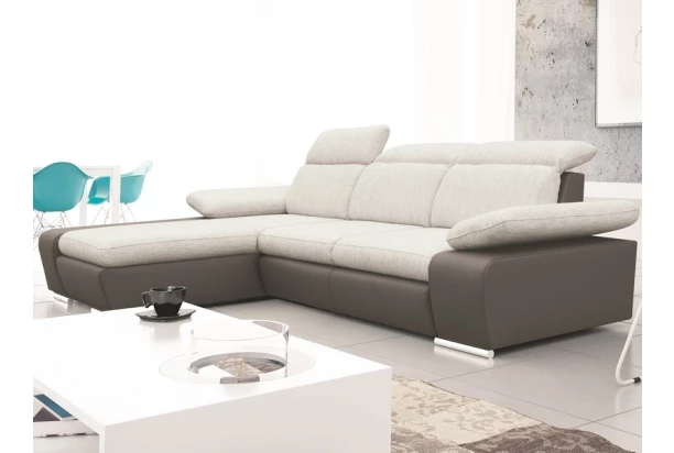 Rohová sedacia súprava s otomanom umiestneným vľavo. Pekné moderné tvary ponúkajú veľmi príjemný komfort – ten je navyše podporený polohovateľnými opierkami hlavy a polohovateľnými opierkami. Vrátane funkcie rozkladu a úložného priestoru.