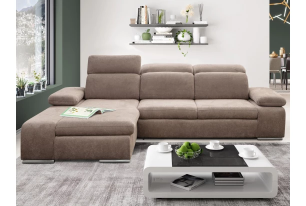 Rohová sedacia súprava má moderné zaoblené tvary a s otomanom tvorí ľavý roh. Príjemný komfort sedenia dopĺňajú polohovateľné bočné podrúčky a polohovateľné horné opierky pre pohodlnú oporu hlavy. Očalúnená mäkkou štruktúrovanou látkou vo farbe svetlo hnedá. Táto moderná rohová sedačka je vybavená funkciou rozkladu na príležitostné lôžko aj úložným priestorom, ktorý nájdete pod výklopným otomanom.