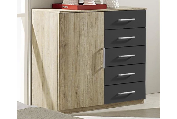 Praktická komoda ponúka kombináciu dverí a 5 zásuviek pre prehľadné ukladanie vecí. Čisté a priamočiare línie dokonale podčiarkuje kontrast dvoch odlišných dekorov.