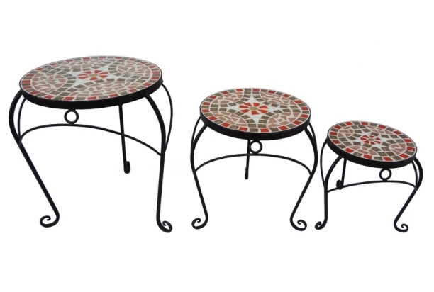 Sada 3 kovových stolíkov s motívom červenej mozaiky nájde svoje miesto nielen na vonkajšej záhrade a balkóne, ale aj kdekoľvek v interiéri.