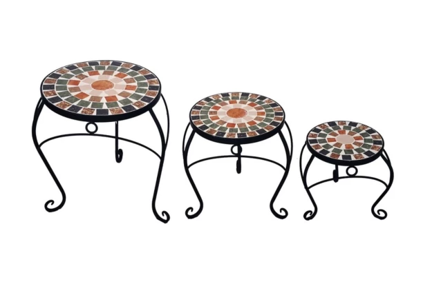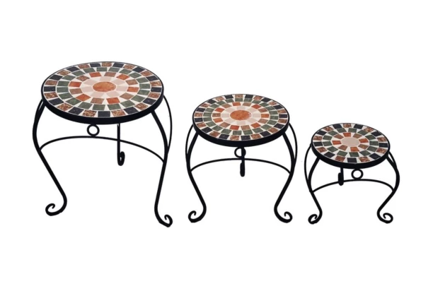 Sada 3 kovových stolíkov s motívom zelenej mozaiky nájde svoje miesto nielen na vonkajšej záhrade a balkóne, ale aj kdekoľvek v interiéri.