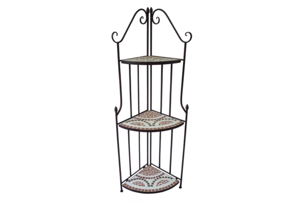 Kovový rohový regál s motívom červenej mozaiky nájde svoje miesto nielen na vonkajšej záhrade a balkóne, ale aj kdekoľvek v interiéri.
