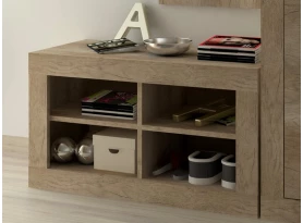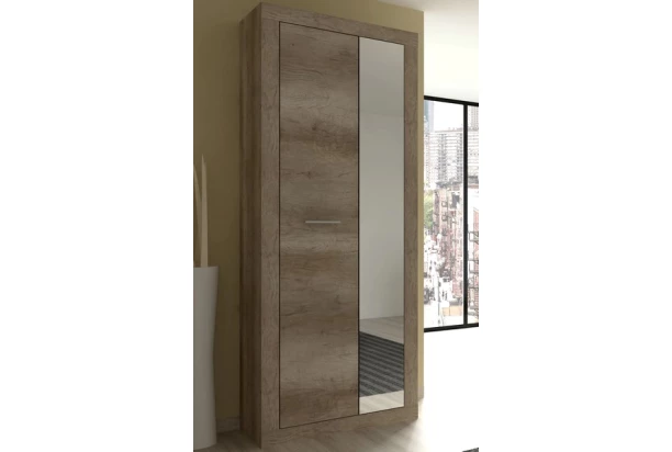 Predsieňová skriňa má široké bočné rámy a pravé dvere doplnené zrkadlom. Je vyrobená v dekore dub Canyon, ktorý imituje prírodné tesané drevo.