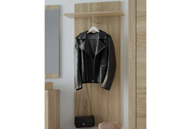 Vešiakový panel obsahuje hornú policu, šatníkovú tyč a tri vešiaky. Drevodekor dub sonoma ľahko pasuje do mnohých interiérov.