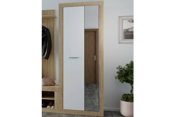 Predsieňová skriňa so širokými rámami, dverami a vysokým zrkadlom. Kombinácia drevodekoru dub sonoma a bielej farby ľahko pasuje do mnohých interiérov.