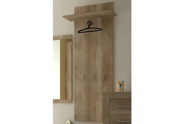 Vešiakový panel obsahuje hornú policu, šatníkovú tyč a tri vešiaky. Je vyrobený v dekore dub Canyon, ktorý imituje prírodné tesané drevo.
