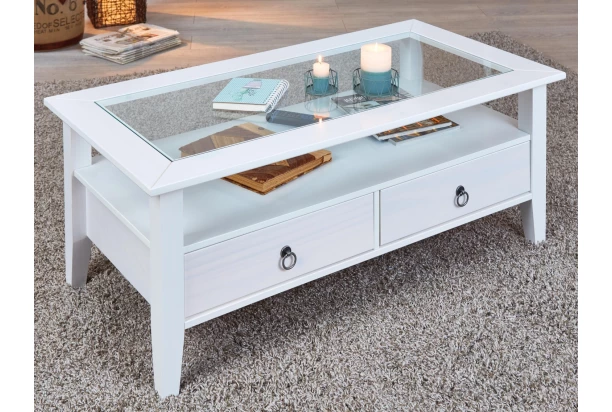 Obdĺžnikový konferenčný stolík v štýle francúzskej Provence je vyrobený z bieleného borovicového dreva a skla. Dve zásuvky s kruhovým úchytom prepožičiavajú nábytku nezameniteľný vzhľad.