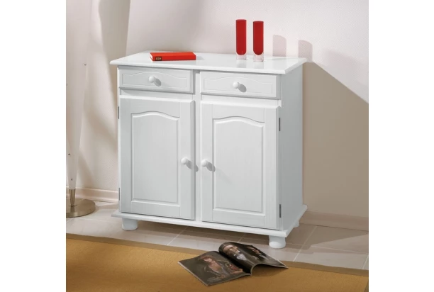 Komoda v obľúbenom vidieckom štýle je vyrobená z bieleného borovicového dreva. Dekoratívne prelisy dverí, tvarované úchyty a masívne nohy dokonale dotvárajú útulnú atmosféru domova.