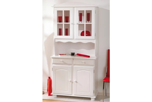 Vitrína v obľúbenom vidieckom štýle je vyrobená z bieleného borovicového dreva. Dekoratívne prelisy dverí, tvarované úchyty a masívne nohy dokonale dotvárajú útulnú atmosféru domova.
