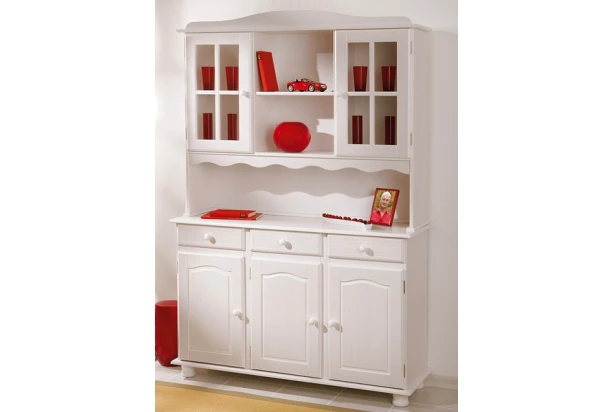 Široká vitrína v obľúbenom vidieckom štýle je vyrobená z bieleného borovicového dreva. Dekoratívne prelisy dverí, tvarované úchyty a masívne nohy dokonale dotvára útulnú atmosféru domova.