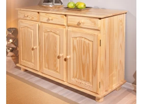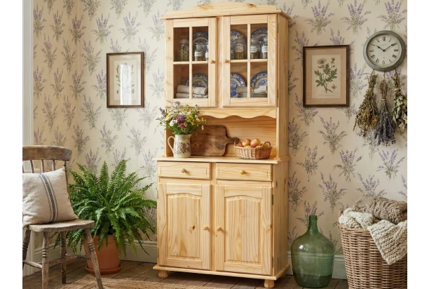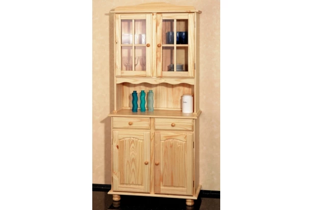 Vitrína v obľúbenom vidieckom štýle je vyrobená z prirodzeného borovicového dreva. Dekoratívne prelisy dverí, tvarované úchyty a masívne nohy dokonale dotvára útulnú atmosféru domova.