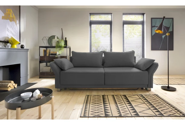Moderná a mäkko vypolstrovaná pohovka s polohovateľnými podrúčkami a veľkými opornými vankúšmi pre každodennú pohodu. Látkový poťah vo farbe tmavo šedá. Priestranná pohovka je navyše vybavená praktickou rozkladacou funkciou a úložným miestom.