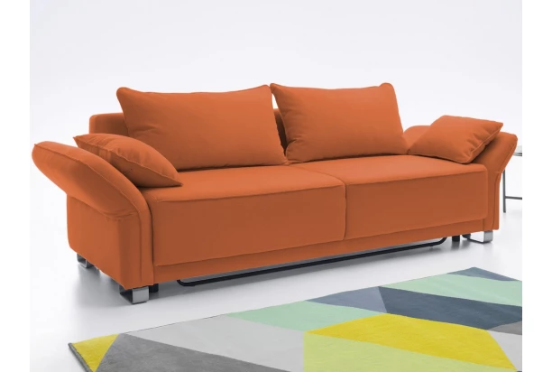Moderná a mäkko vypolstrovaná pohovka s polohovateľnými podrúčkami a veľkými opornými vankúšmi pre každodennú pohodu. Látkový poťah vo farbe tehlová oranžová. Priestranná pohovka je navyše vybavená praktickou rozkladacou funkciou a úložným miestom.