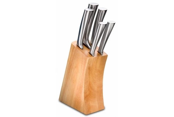 Moderné 6-dielna súprava obsahuje 5 kuchynských nerezových nožov v profesionálnej kvalite a navyše stabilný stojan z prírodného masívneho dreva – všetky nože tak budete mať vždy po ruke.