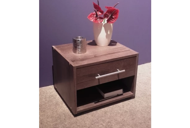 Základný typ nočného stolíka s jednou zásuvkou a otvorenou priehradkou je vyrobený v dekore bahenný dub.
