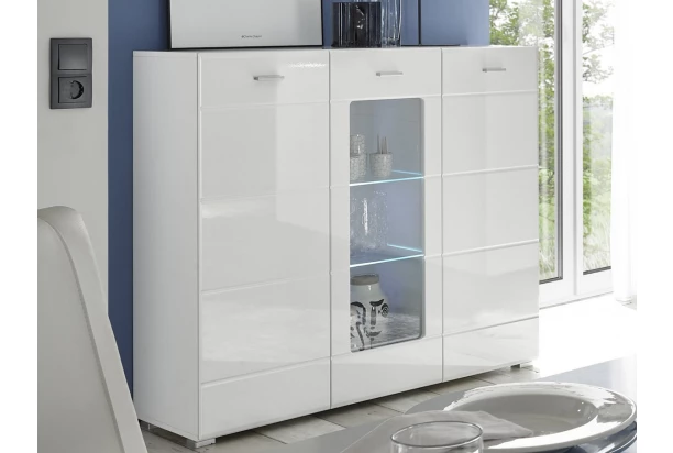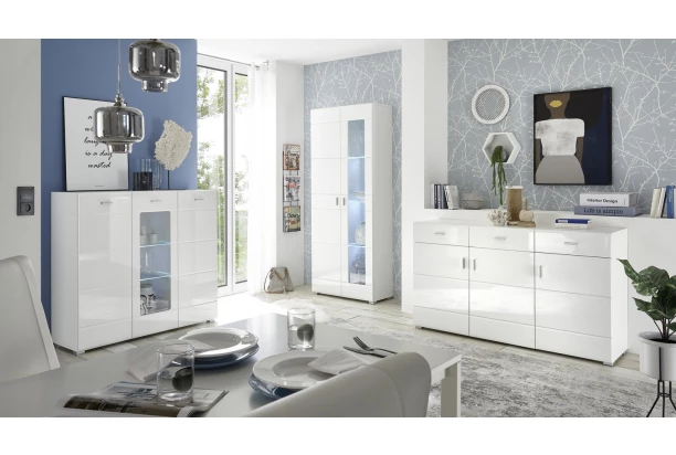 Vysoká komoda s presklením v prevedení lesklá biela má univerzálny štýl a môžete ju ľubovoľne kombinovať s akýmikoľvek farbami a dekoráciami vo Vašom interiéri. Vnútorné police v presklenej časti navyše dopĺňa osvetlenie