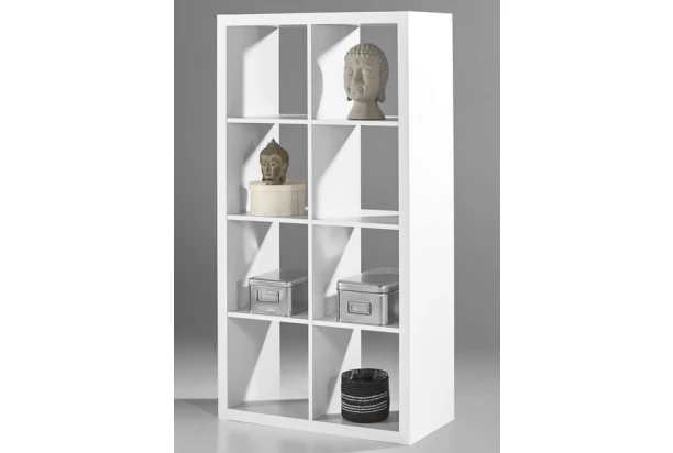 Univerzálny biely regál o veľkosti 4×2 môžete umiestniť priamo k stene alebo voľne do priestoru miestnosti.