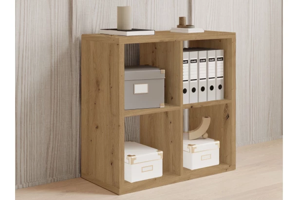 Univerzálny regál v dekore dub artisan o veľkosti 2×2 môžete umiestniť priamo k stene alebo voľne do priestoru miestnosti. Tento regál so 4 priehradkami pasuje ako do obývačky, tak do jedálne, detskej izby alebo napríklad pracovne. Do priehradok môžete ukladať dekorácie, knižky, hračky alebo iné potreby. Priehradky môžete navyše doplniť úložnými látkovými boxmi na prehľadné ukladanie drobností.