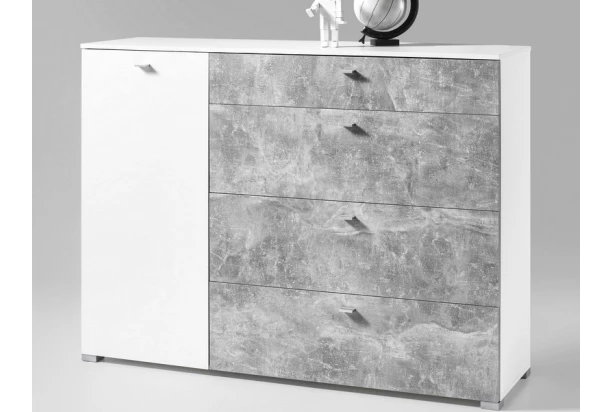 Široká zásuvková komoda zo série Balcony v trendovej kombinácii bielej farby a imitácie šedého betónu. Oceníte predovšetkým extra objemné úložné zásuvky, do ktorých môžete všetko prehľadne ukladať.