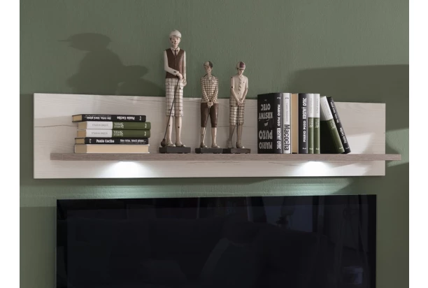 Kvalitná nástenná polica o šírke 130 cm v kombinácii bielená pínia/sivý dub vytvorí útulnú domácu klímu.