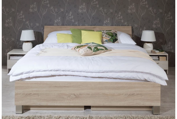 Posteľ o rozmere lôžka 180×200 cm je vyrobená v dekore dub sonoma. Stabilný rám postele navyše obsahuje výklopné lamelové rošty aj úložné perináky pod lôžkom. Univerzálny funkčný dizajn sa hodí ako do modernej, tak do klasickej spálne.
